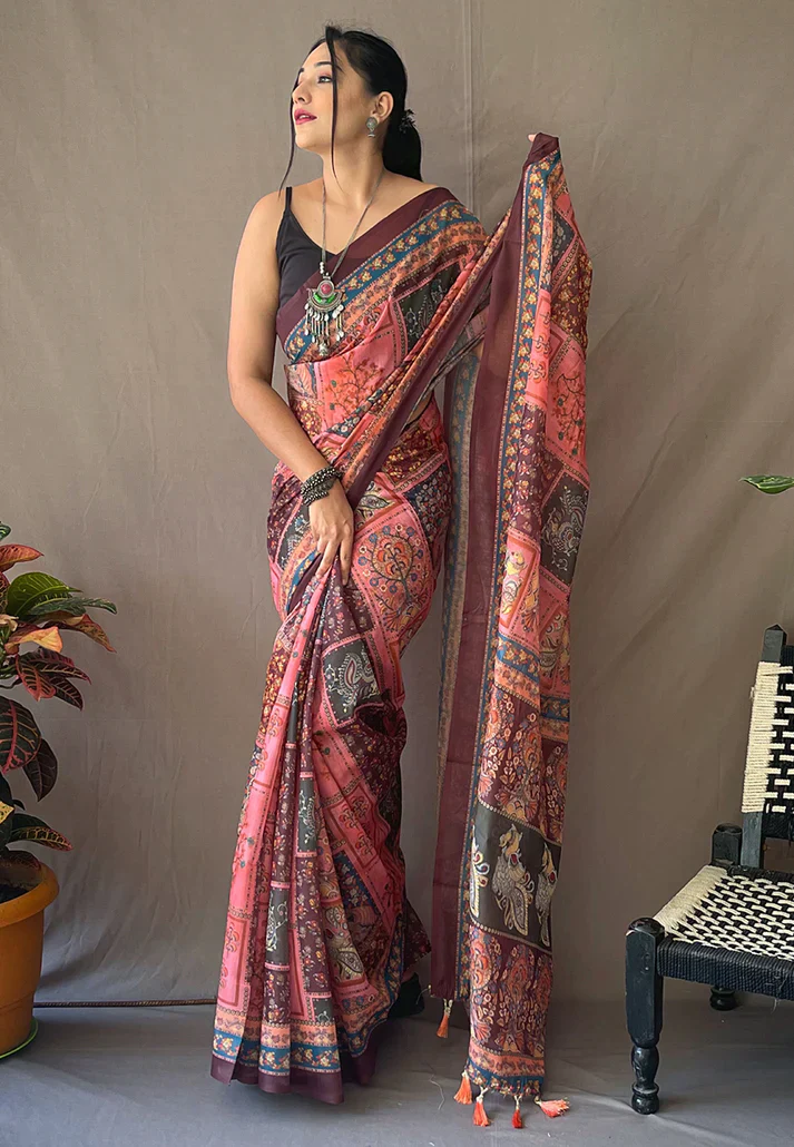 Saree Name =1 MIN Ready To Wear Cotton Kalamkari Printed Saree Deep Pink -Square