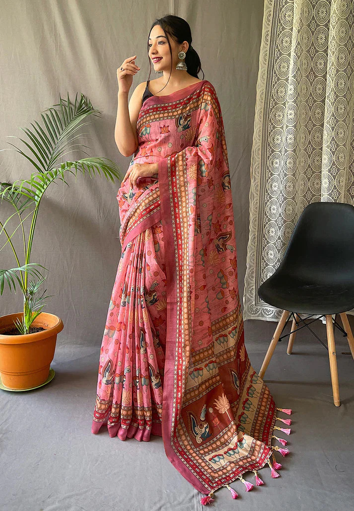 Kadambari Cotton Kalamkari Printed Saree Pink