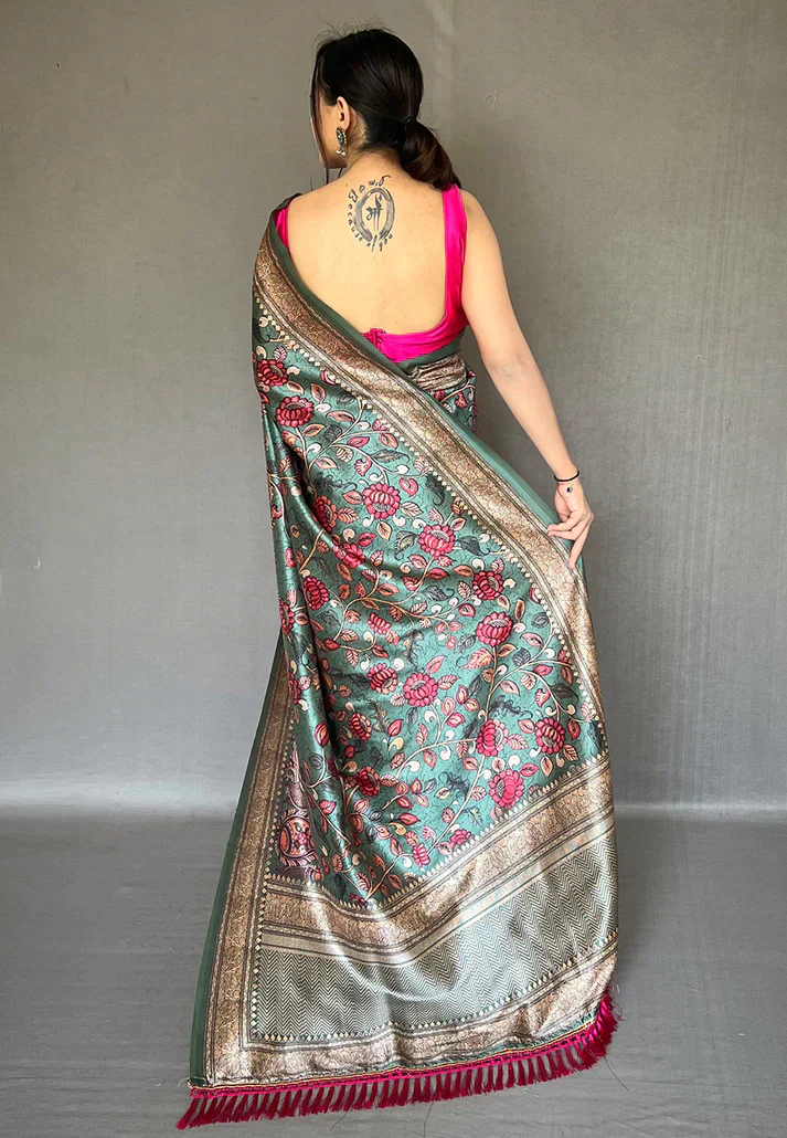 Teal Blue Diva Soft Silk Kalamkari Printed Saree