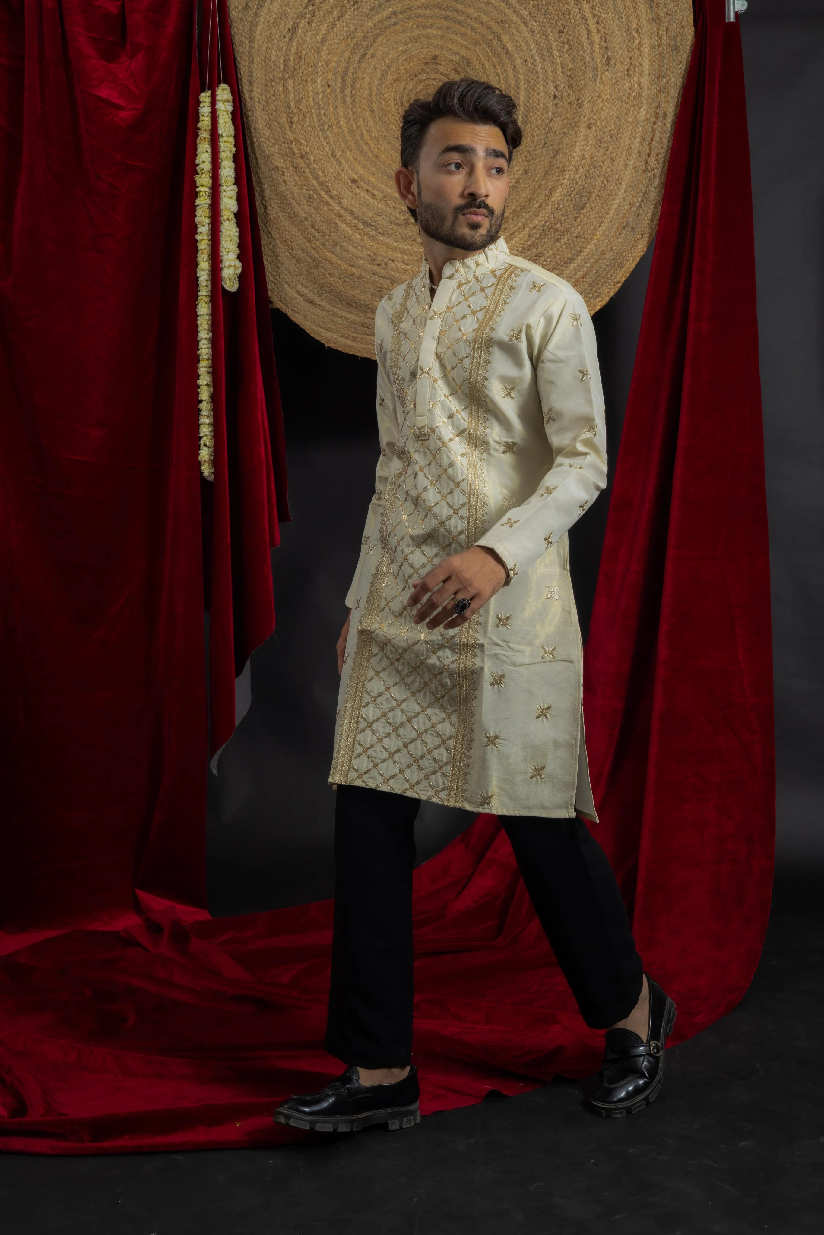Elevate your ethnic wardrobe with this exquisite ivory and gold embroidered kurta from SHRIIMANT. Crafted with intricate zari work and detailed TISSUE FABRIC AND EMBROIDERED patterns, this designer Indo kurta is a perfect blend of regal elegance and modern sophistication.