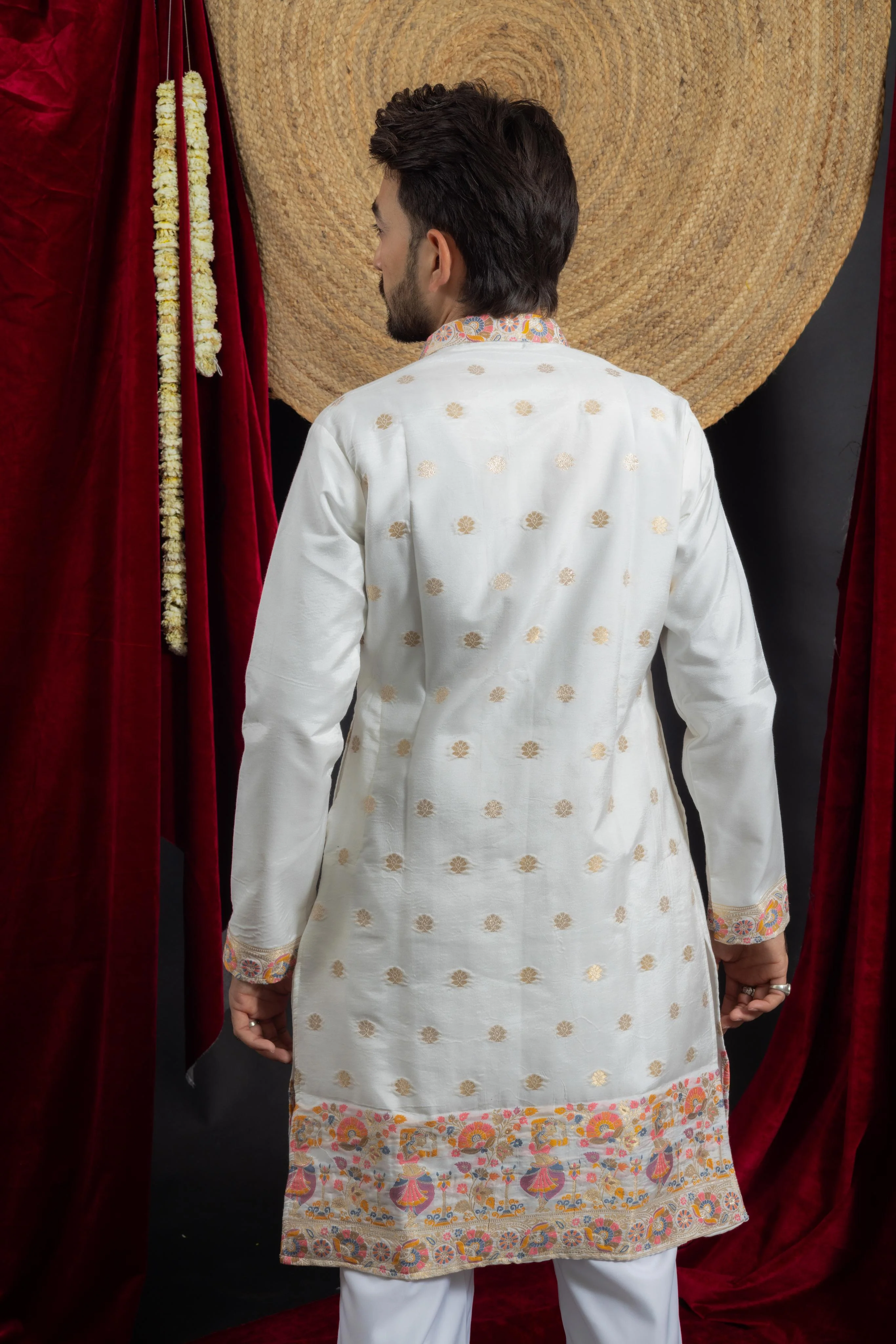 The contrasting mandarin collar and cuffs are adorned with detailed embroidery, enhancing the kurtaâs grandeur. The straight-cut silhouette ensures a regal yet comfortable fit, making it an ideal choice for weddings, festivals, and grand celebrations. Pair it with classic churidar pants or tailored trousers to complete the look.