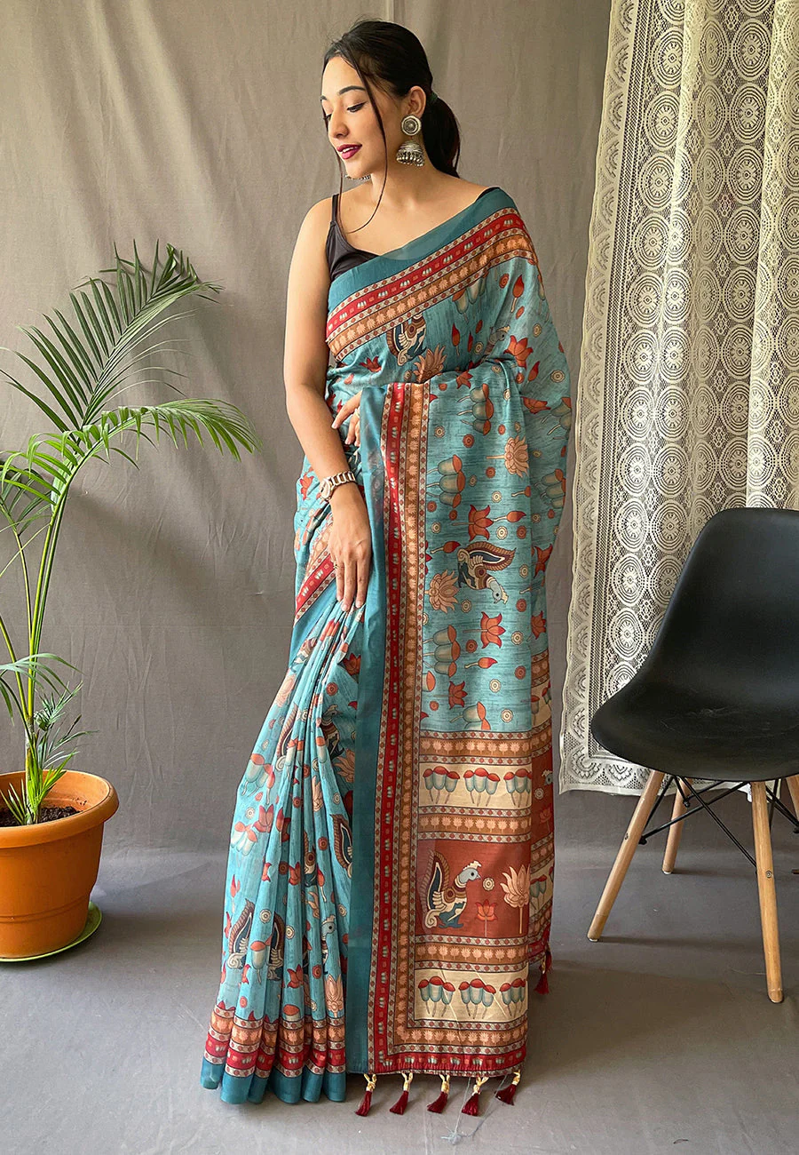 Kadambari Cotton Kalamkari Printed Saree Blue