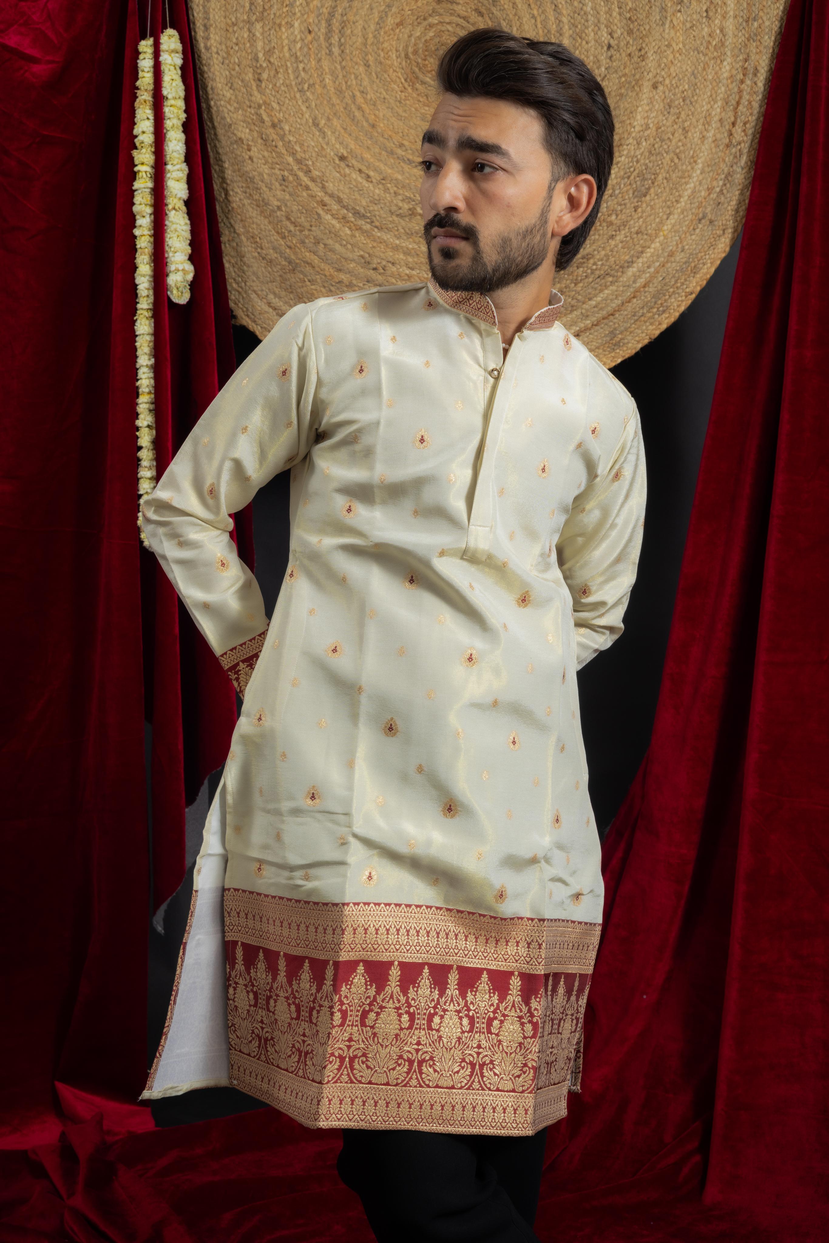 Step into timeless elegance with this luxurious muslin cotton kurta, intricately woven with golden motifs and accentuated with a rich maroon jacquard border. Designed for the modern gentleman with a taste for heritage craftsmanship, this kurta features regal zari jacquard work on the cuffs and hem, creating a striking contrast that exudes royalty.