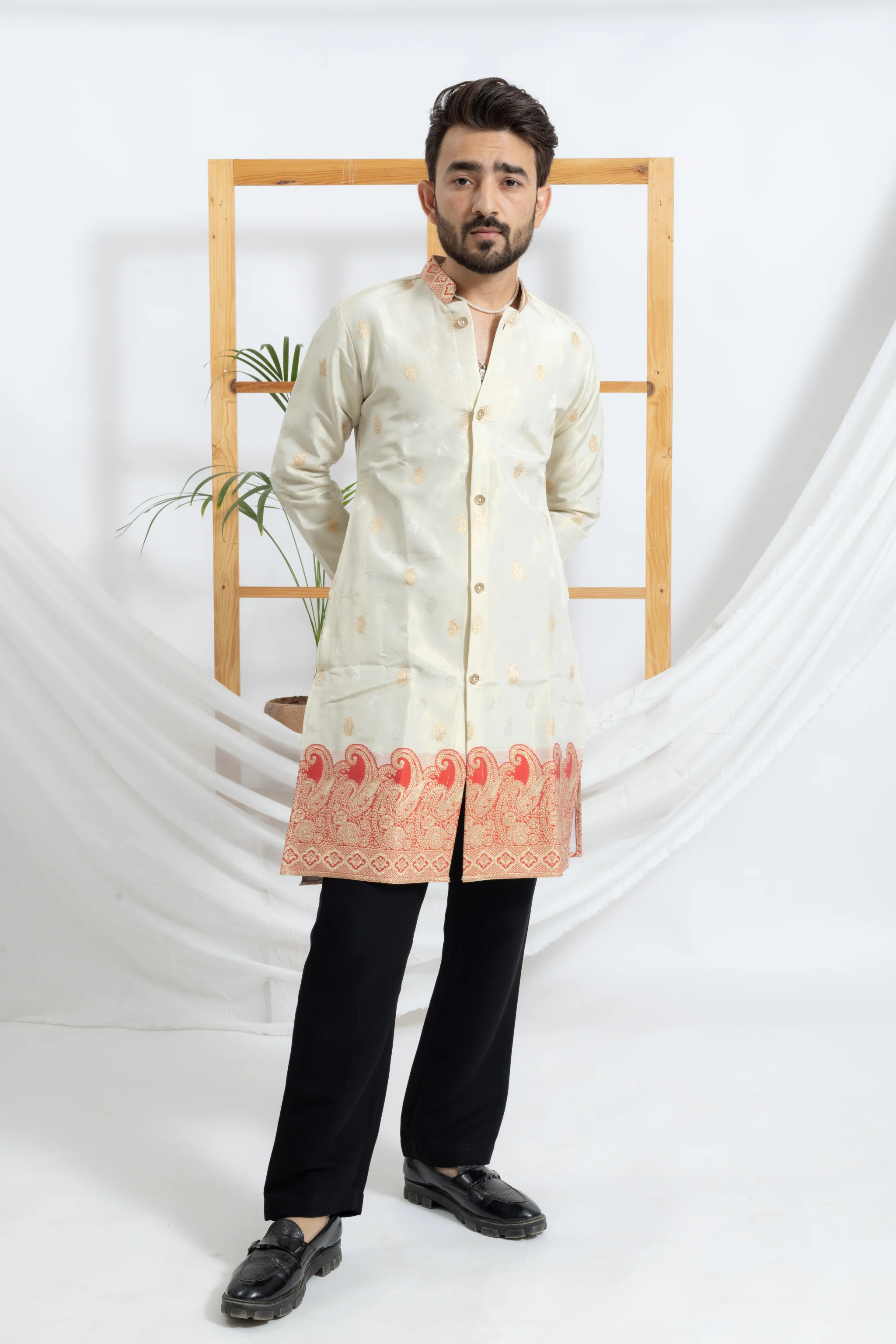 Elevate your festive and wedding wardrobe with this Ivory & Red Banarasi rajshahi keri Jacquard Kurta from SHRIIMANT, crafted for the modern man who values timeless elegance and intricate craftsmanship. Featuring luxurious paisley and floral motifs woven in golden zari, this kurta exudes royal sophistication. The rich red border adds a bold touch, making it a standout piece for any celebration.
